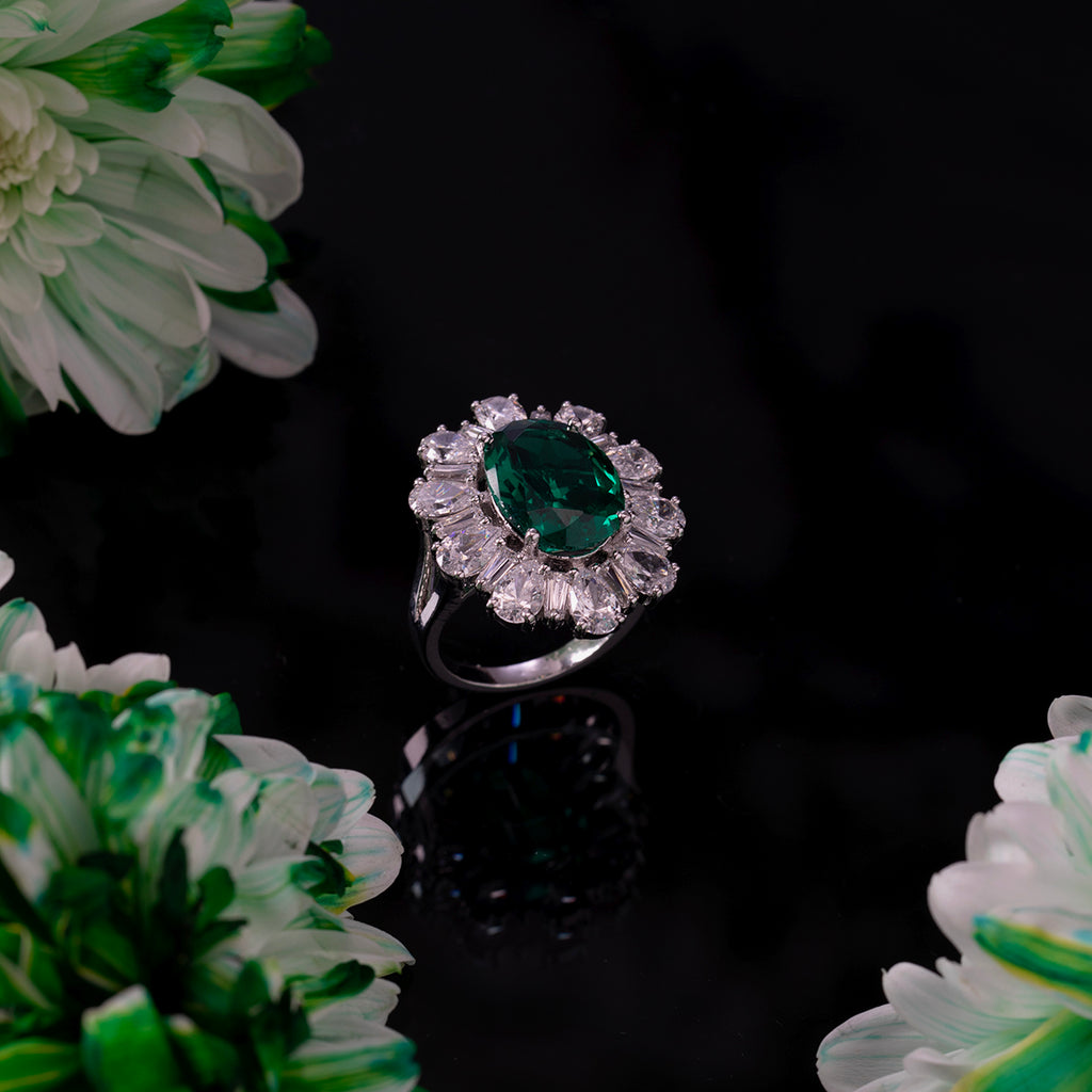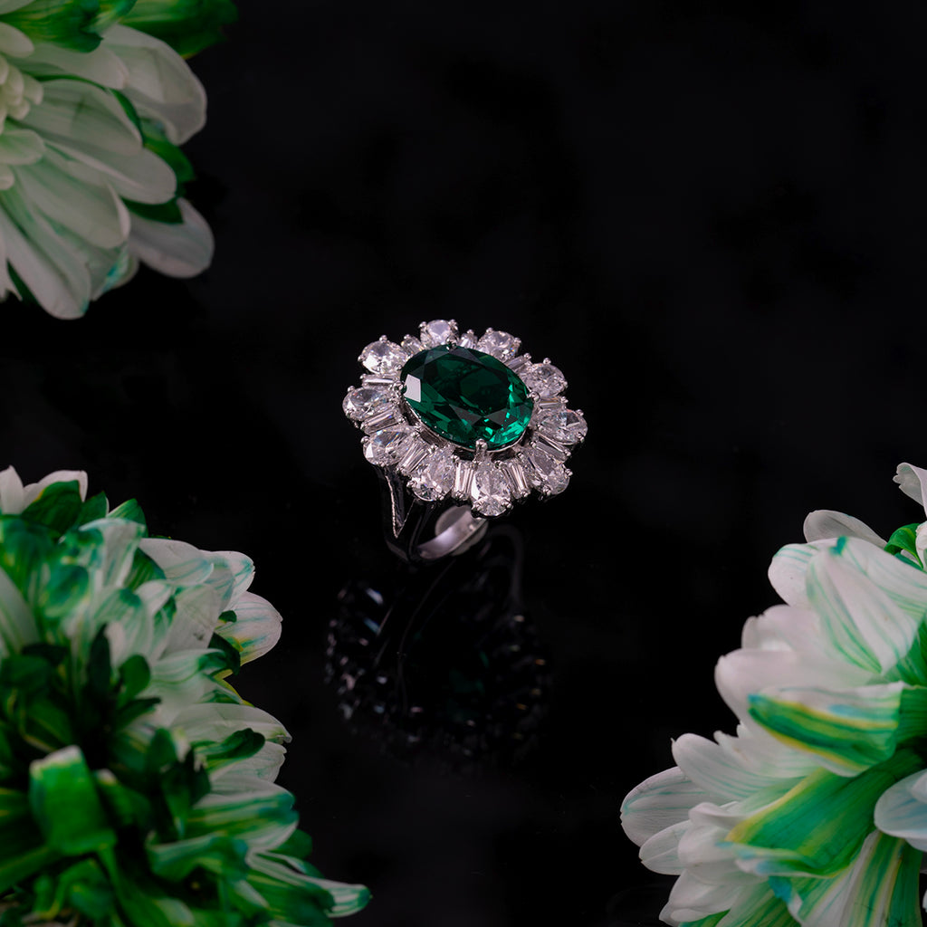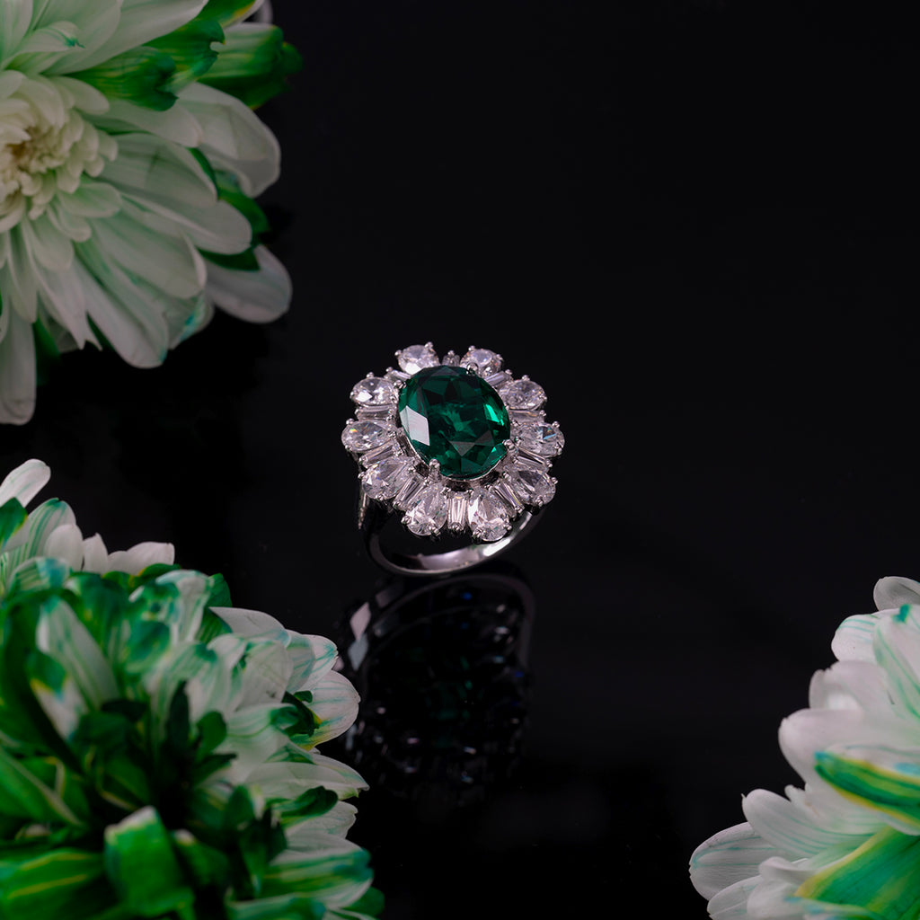 A stunning emerald takes center stage, surrounded by glimmering accents. Bright, playful, and made to turn heads wherever you go.